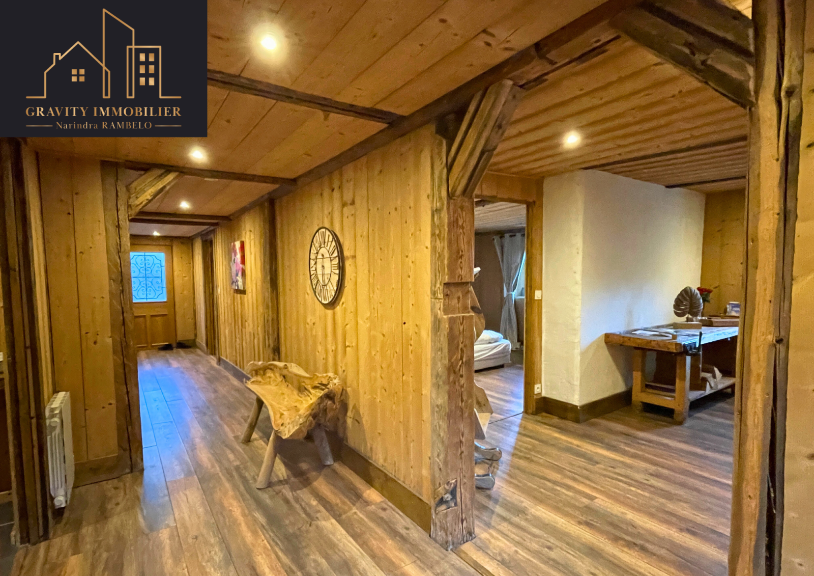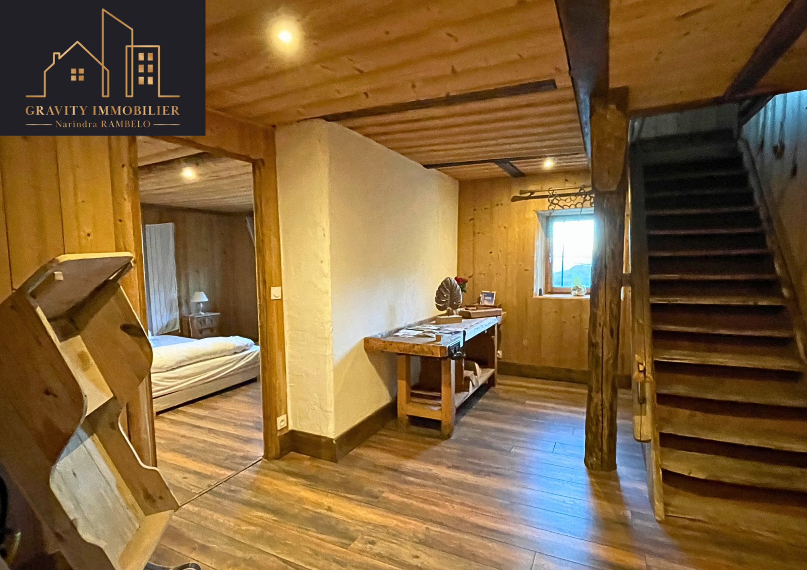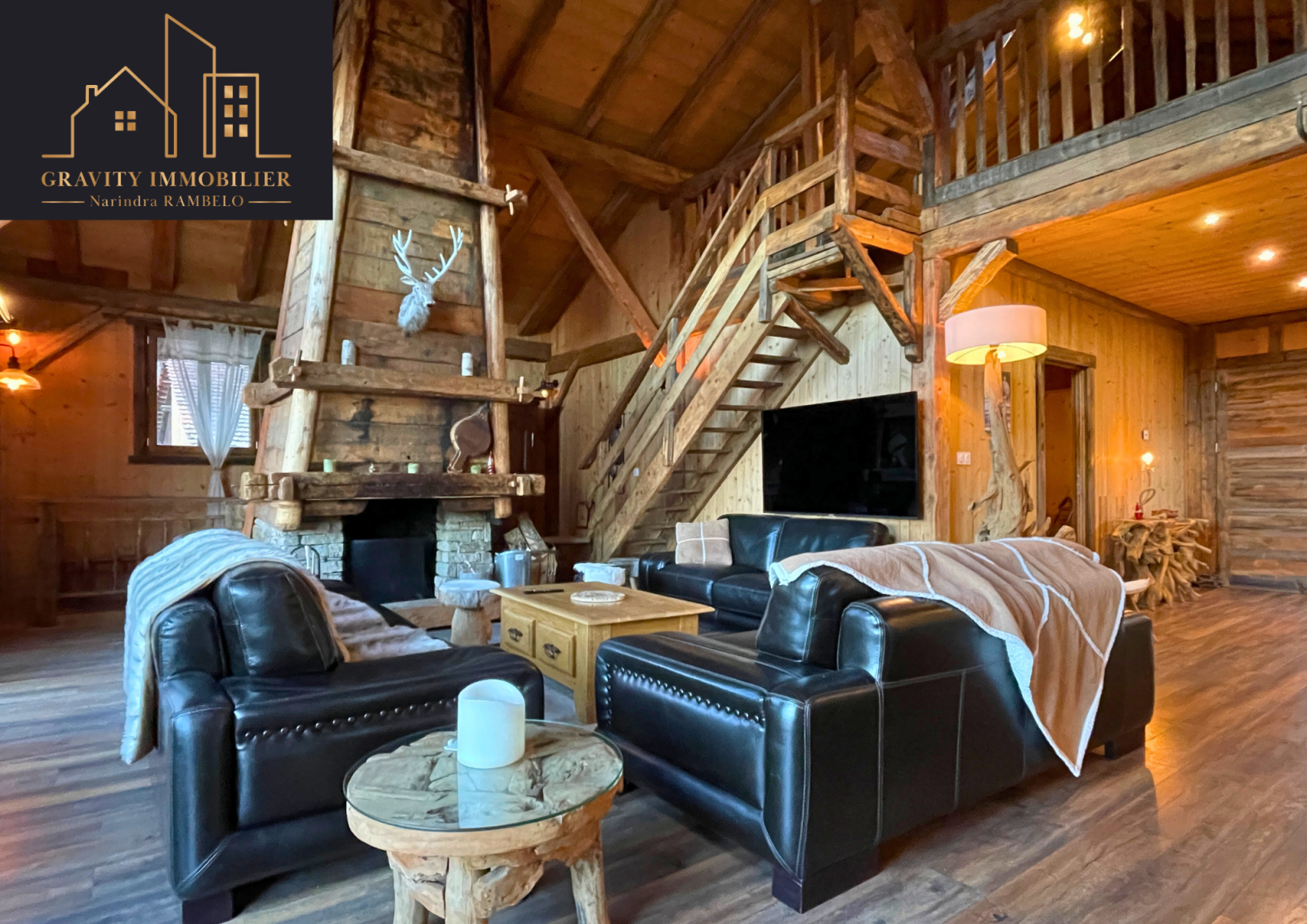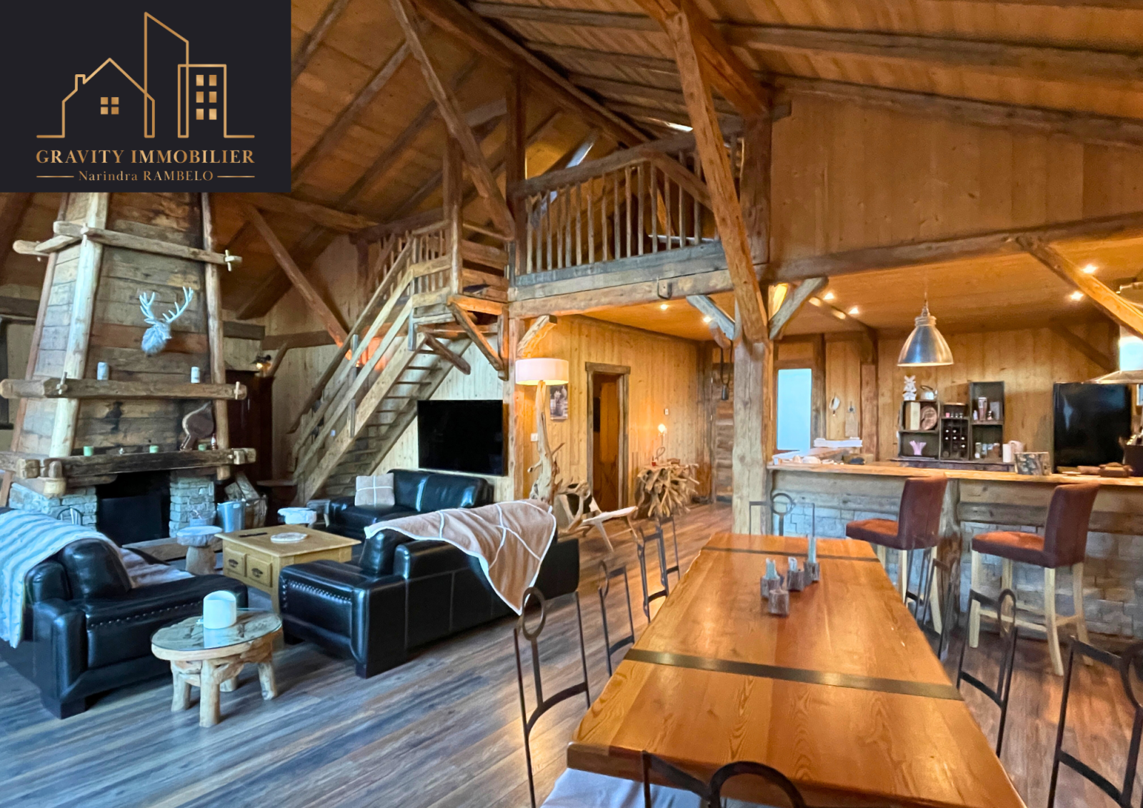 - Étage supérieur : Grande pièce de vie de 75m² avec cuisine américaine équipée et cheminée sur toute la hauteur. Une suite parentale de 27m² avec salle de bains, et un balcon offrant une vue imprenable sur la vallée et les montagnes