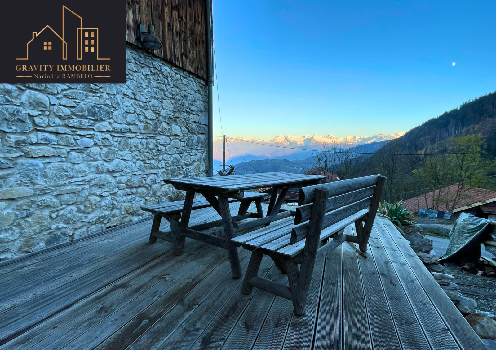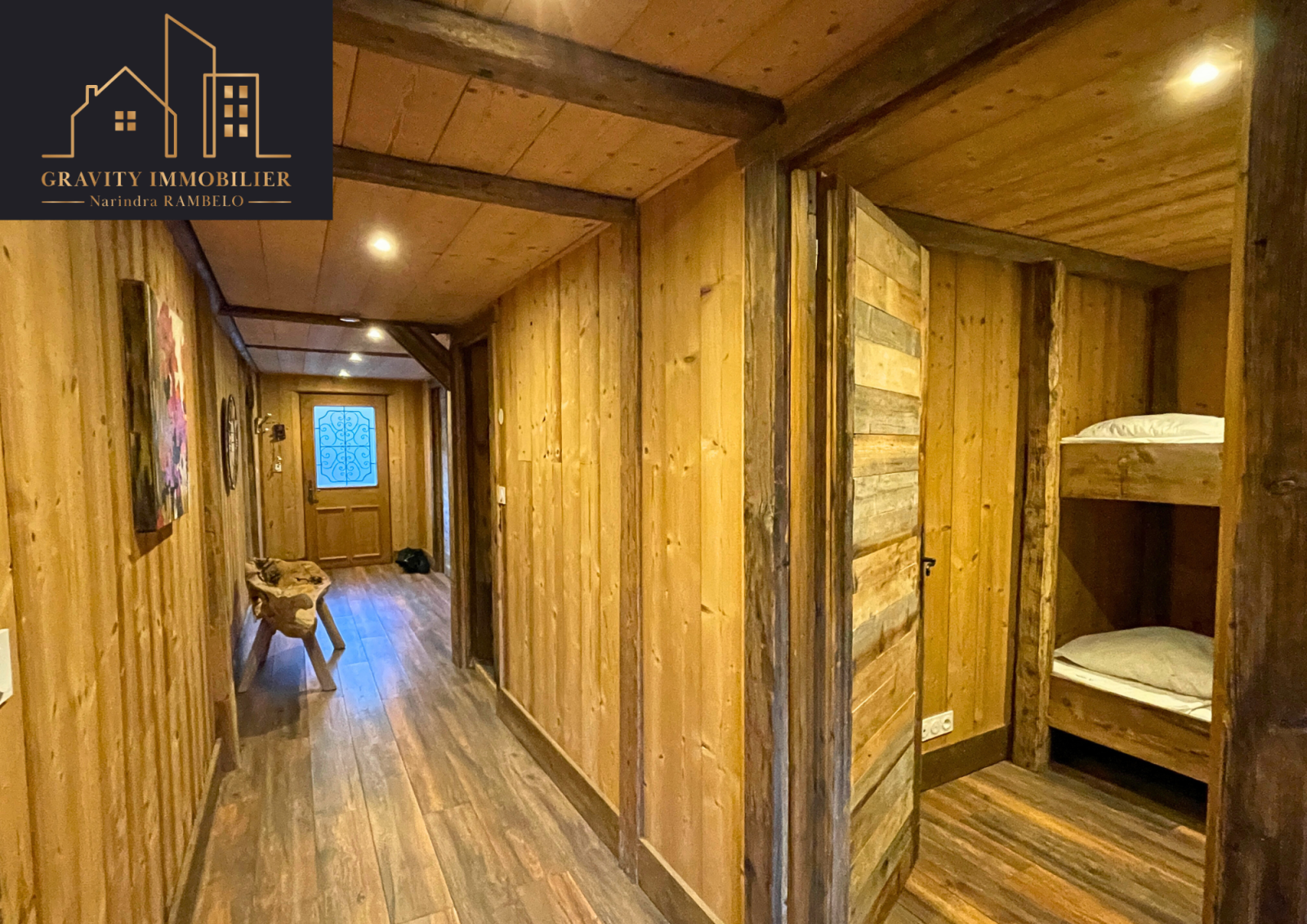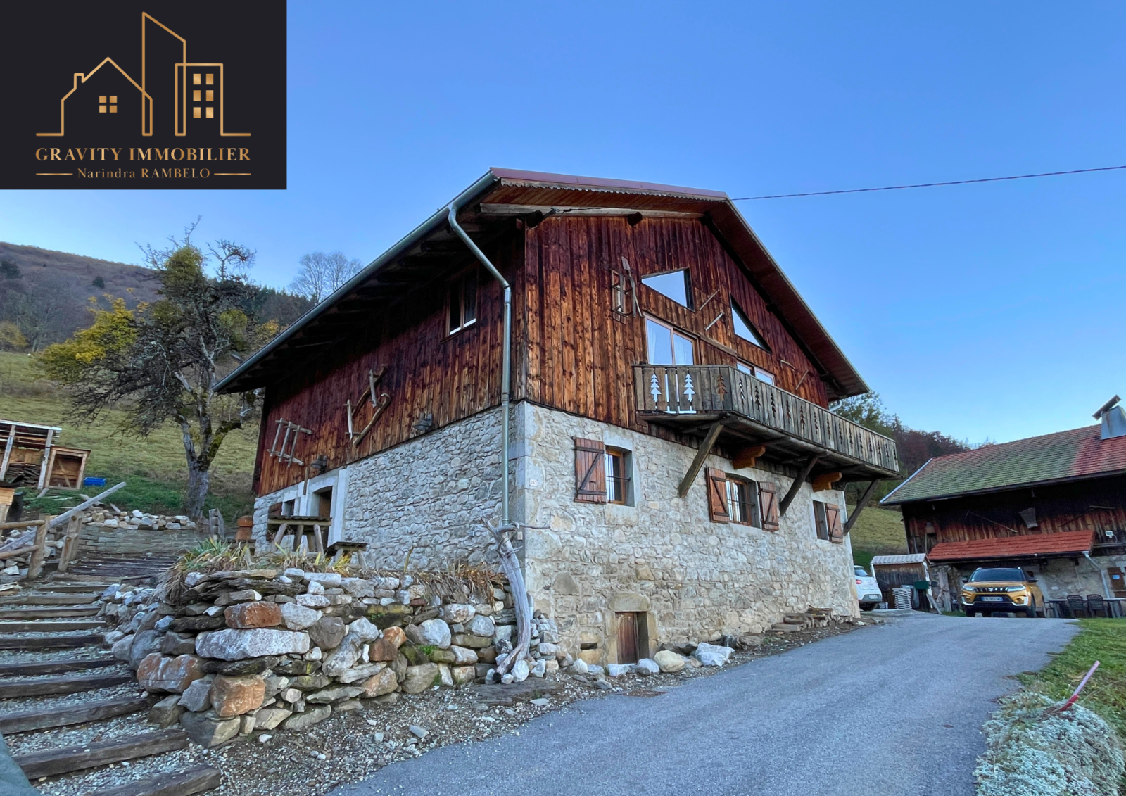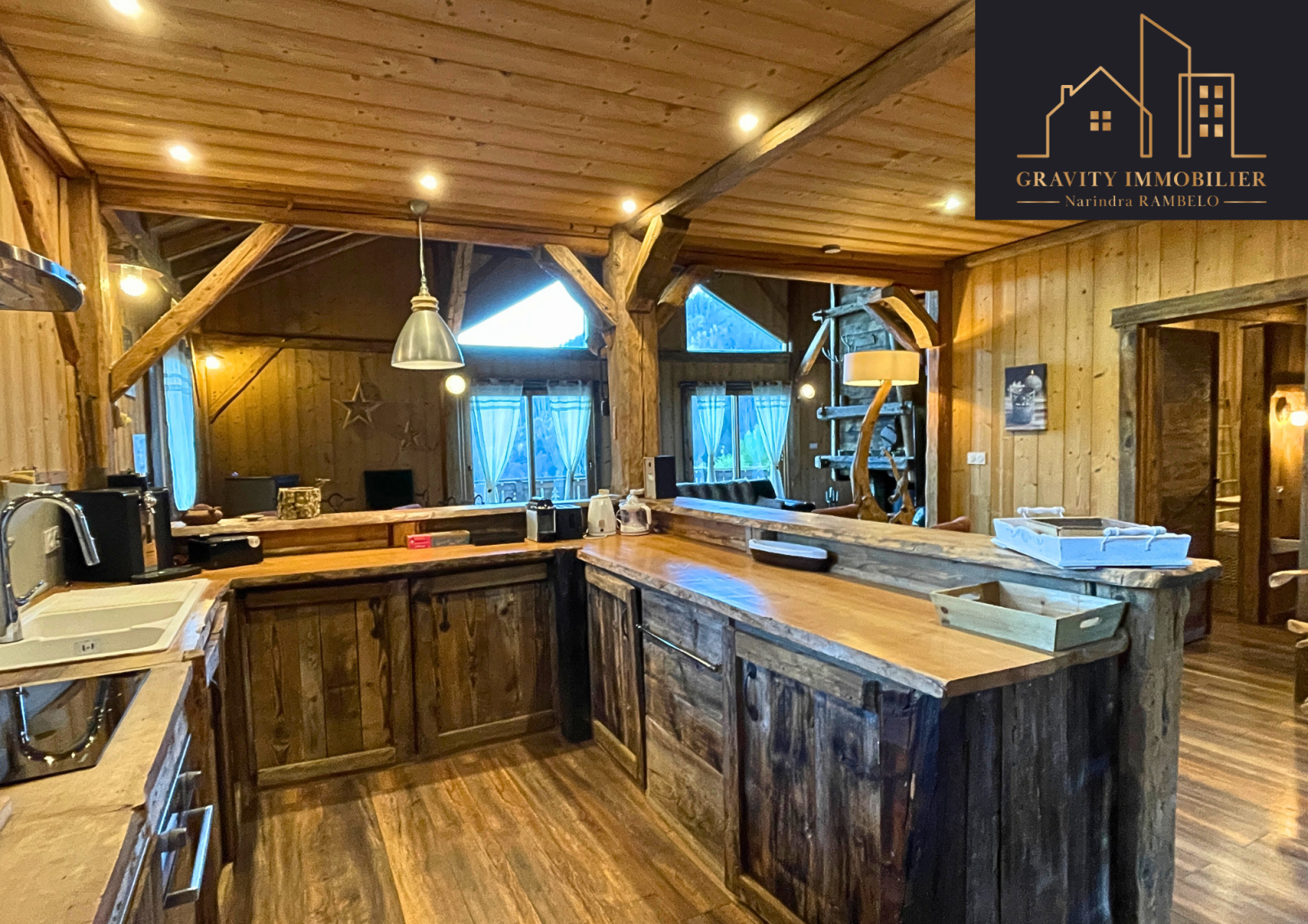 - Étage supérieur : Grande pièce de vie de 75m² avec cuisine américaine équipée et cheminée sur toute la hauteur. Une suite parentale de 27m² avec salle de bains, et un balcon offrant une vue imprenable sur la vallée et les montagnes