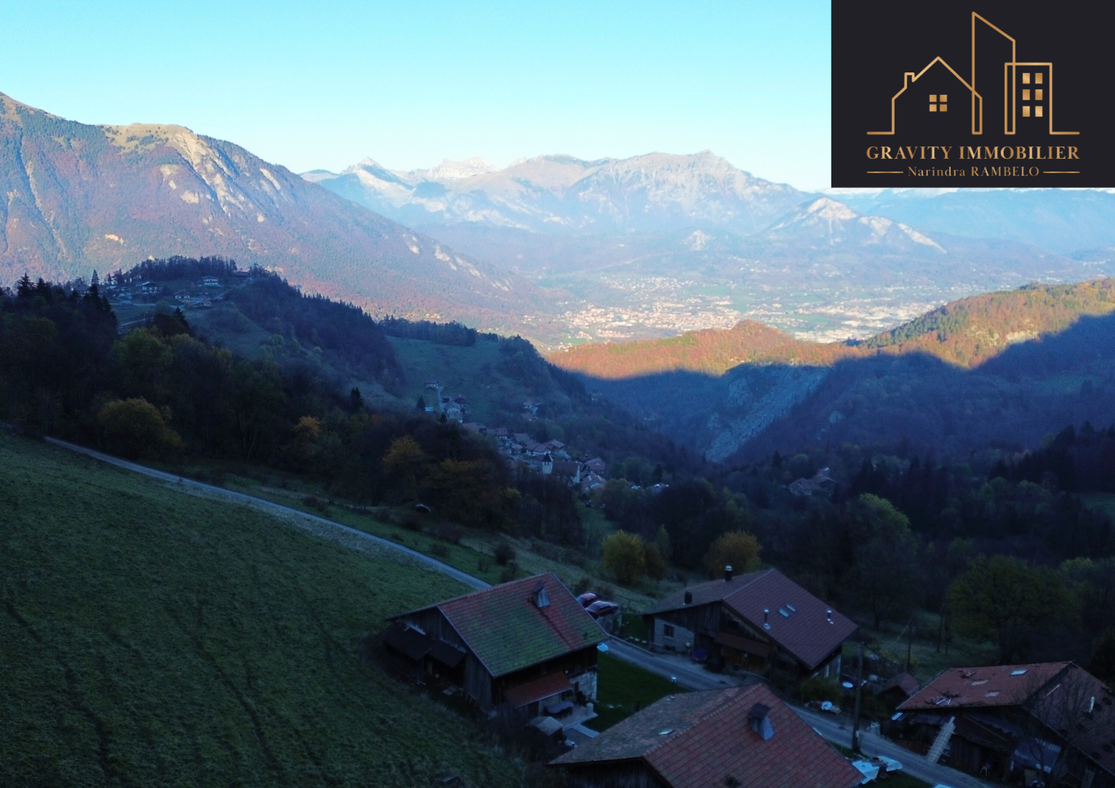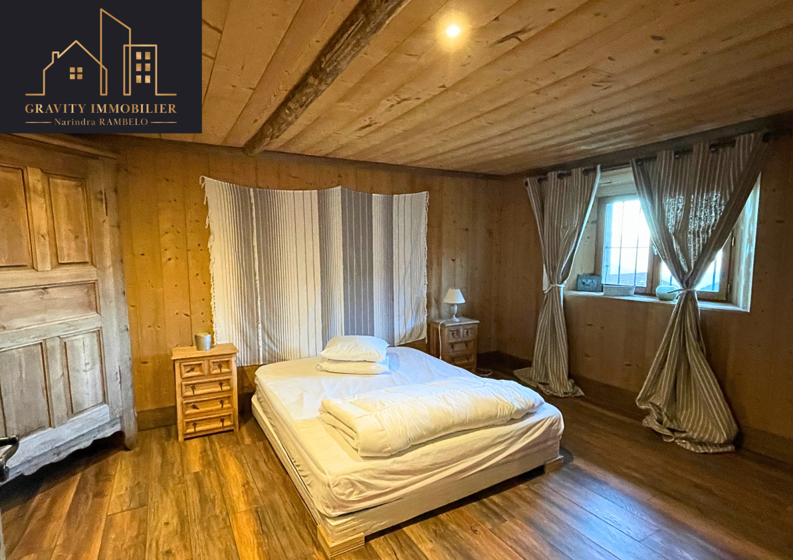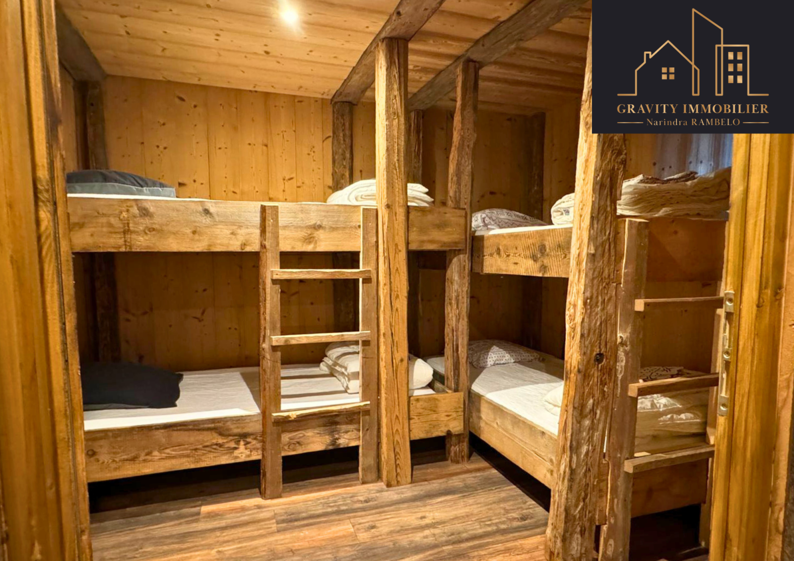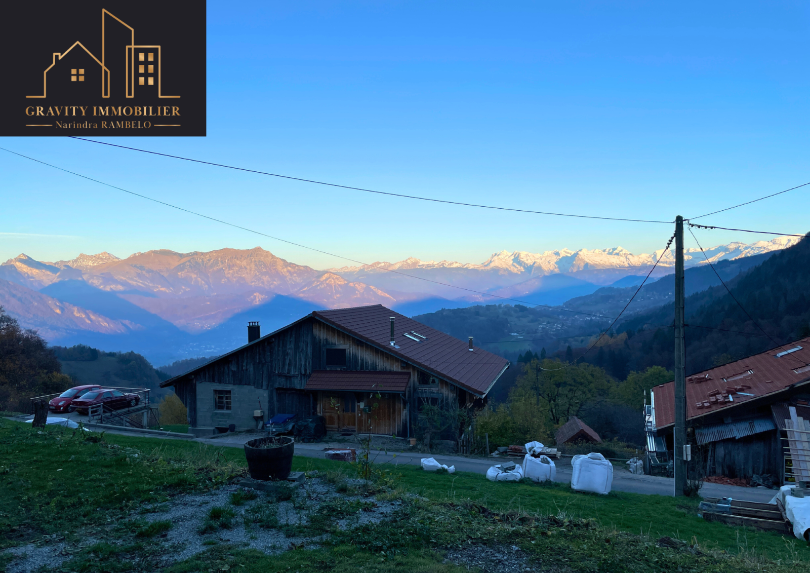 - Étage supérieur : Grande pièce de vie de 75m² avec cuisine américaine équipée et cheminée sur toute la hauteur. Une suite parentale de 27m² avec salle de bains, et un balcon offrant une vue imprenable sur la vallée et les montagnes