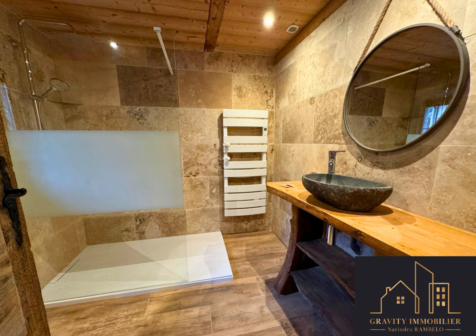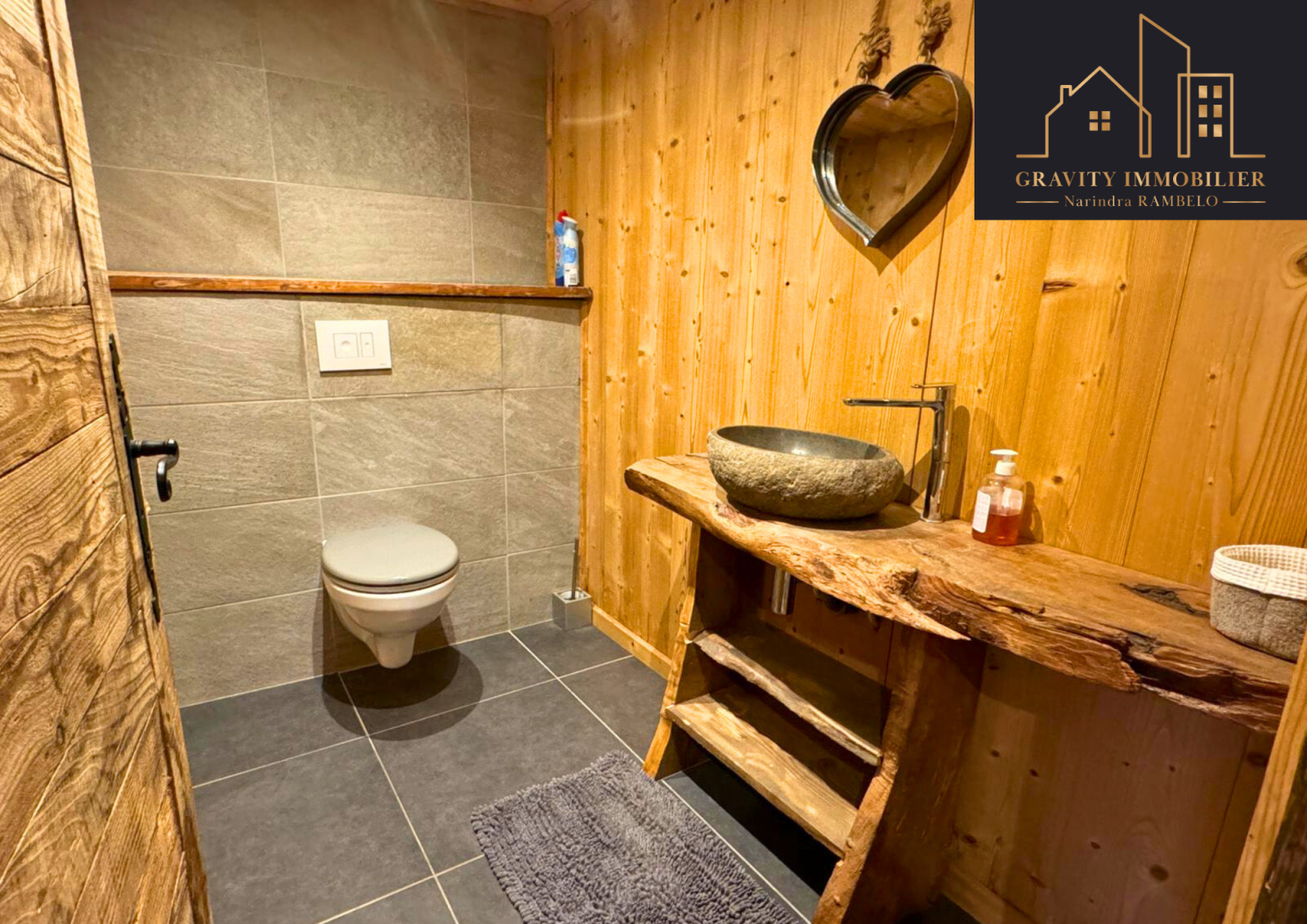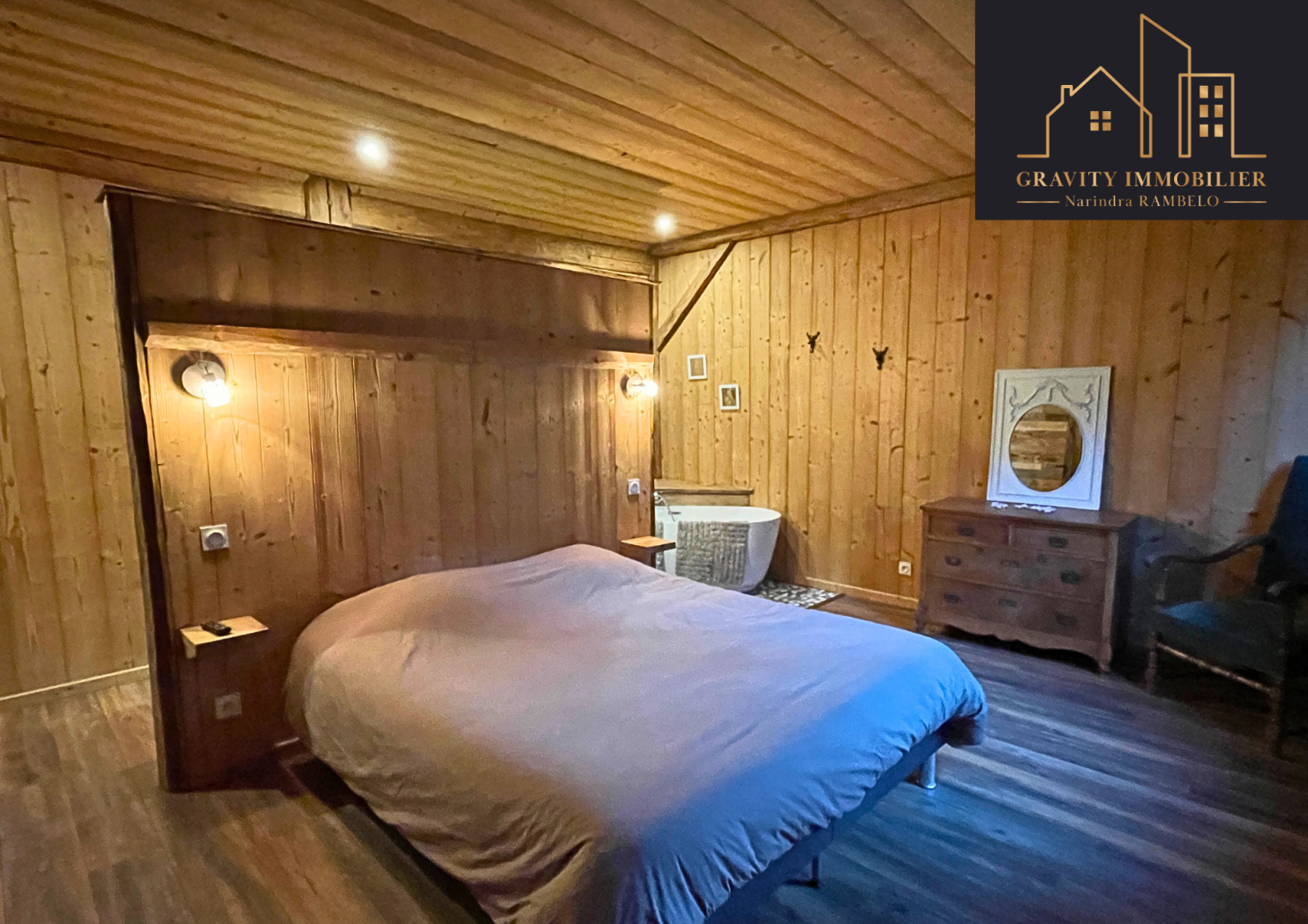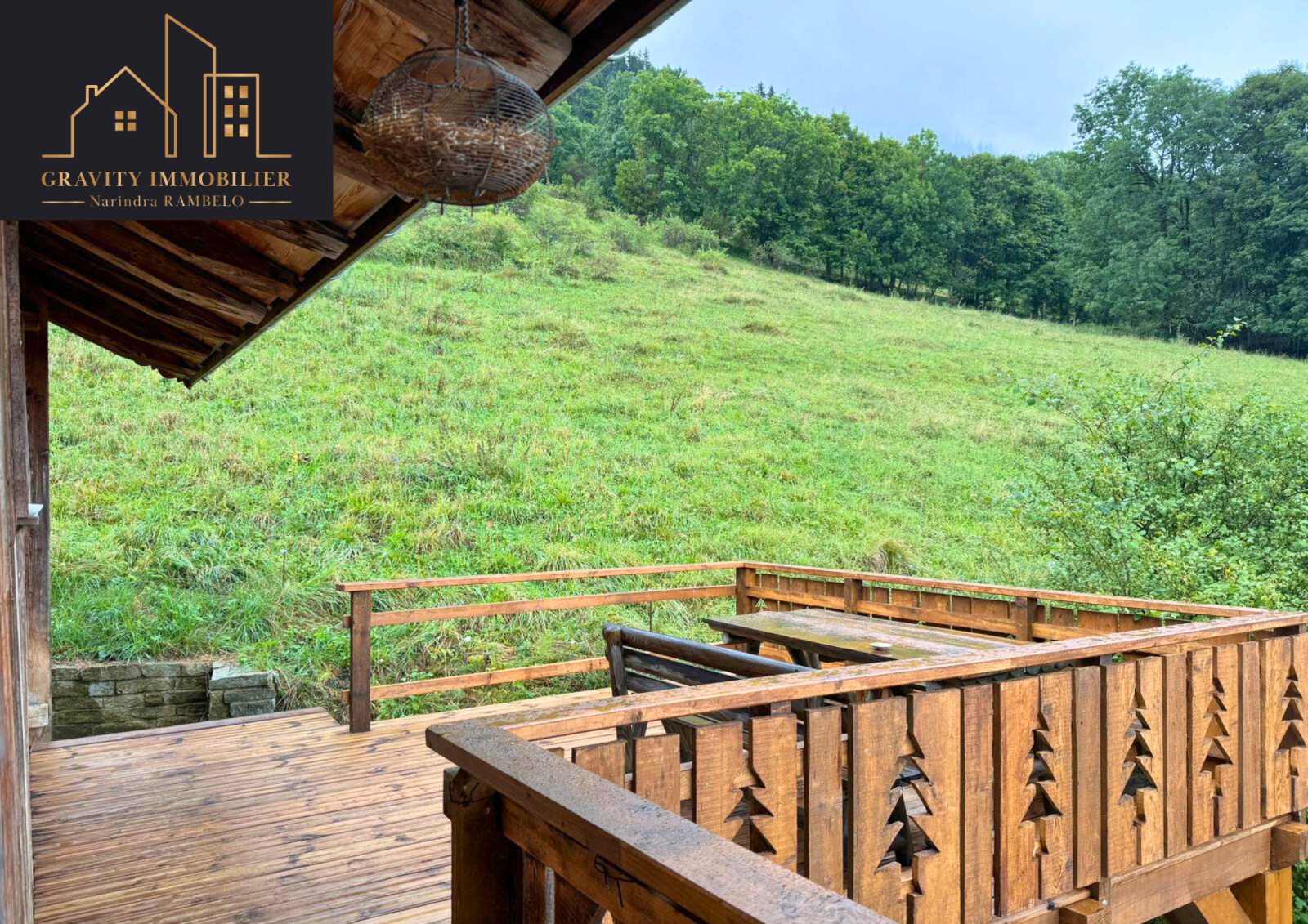 - Étage supérieur : Grande pièce de vie de 75m² avec cuisine américaine équipée et cheminée sur toute la hauteur. Une suite parentale de 27m² avec salle de bains, et un balcon offrant une vue imprenable sur la vallée et les montagnes