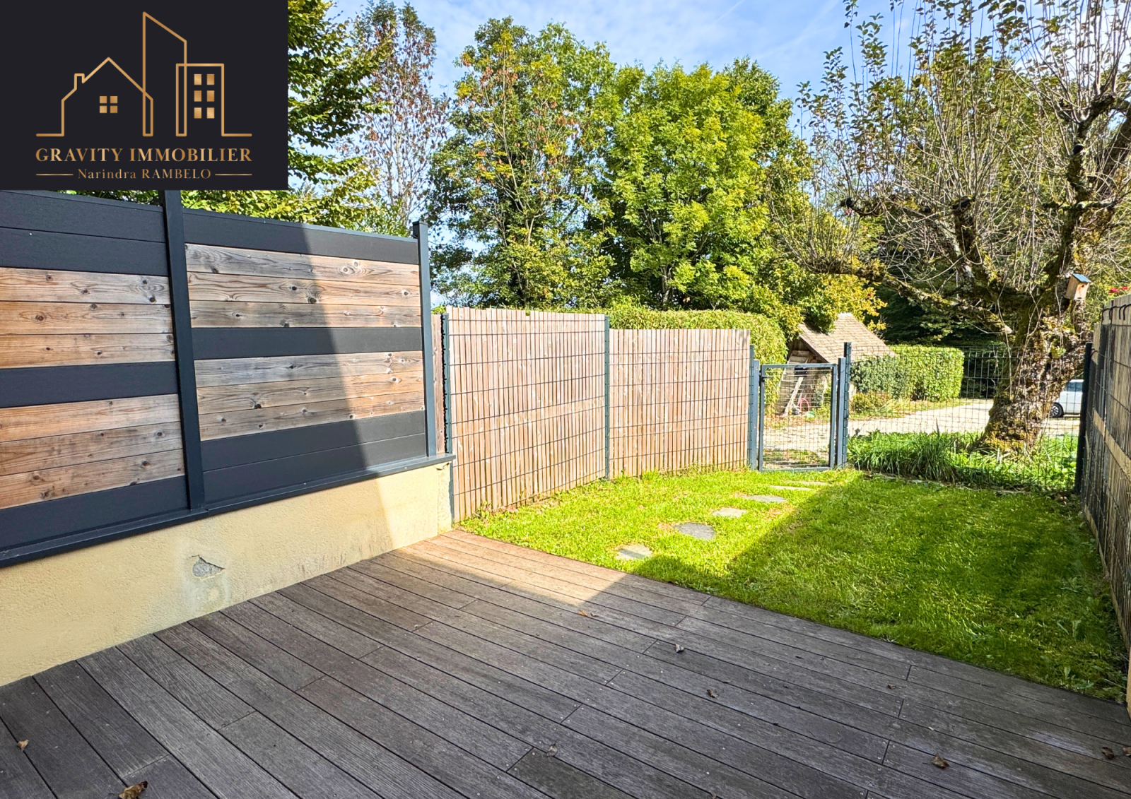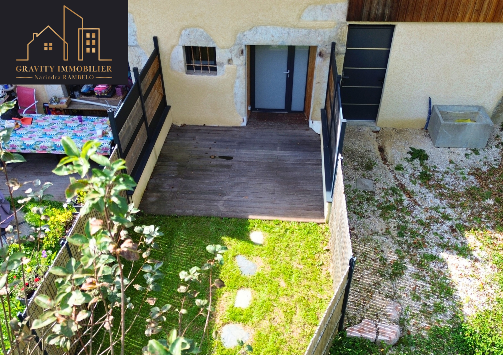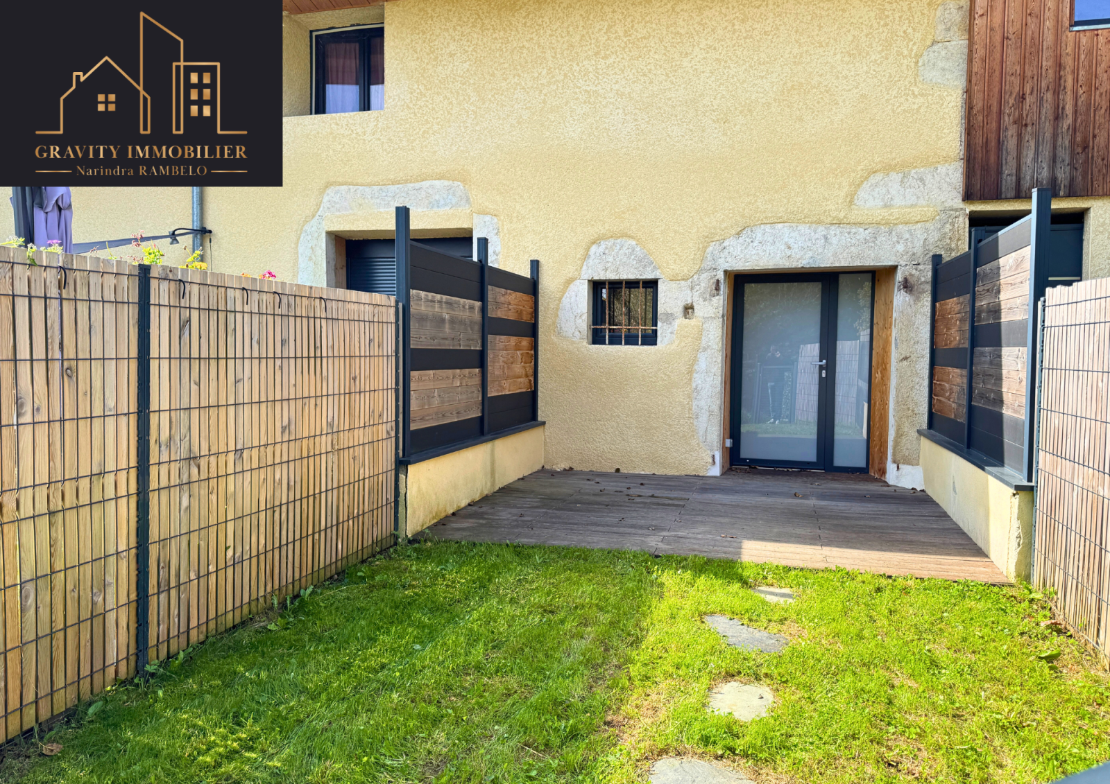 Jardin et terrasse avant sans vis-à-vis + seconde terrasse arrière avec possibilité de jardinet ;