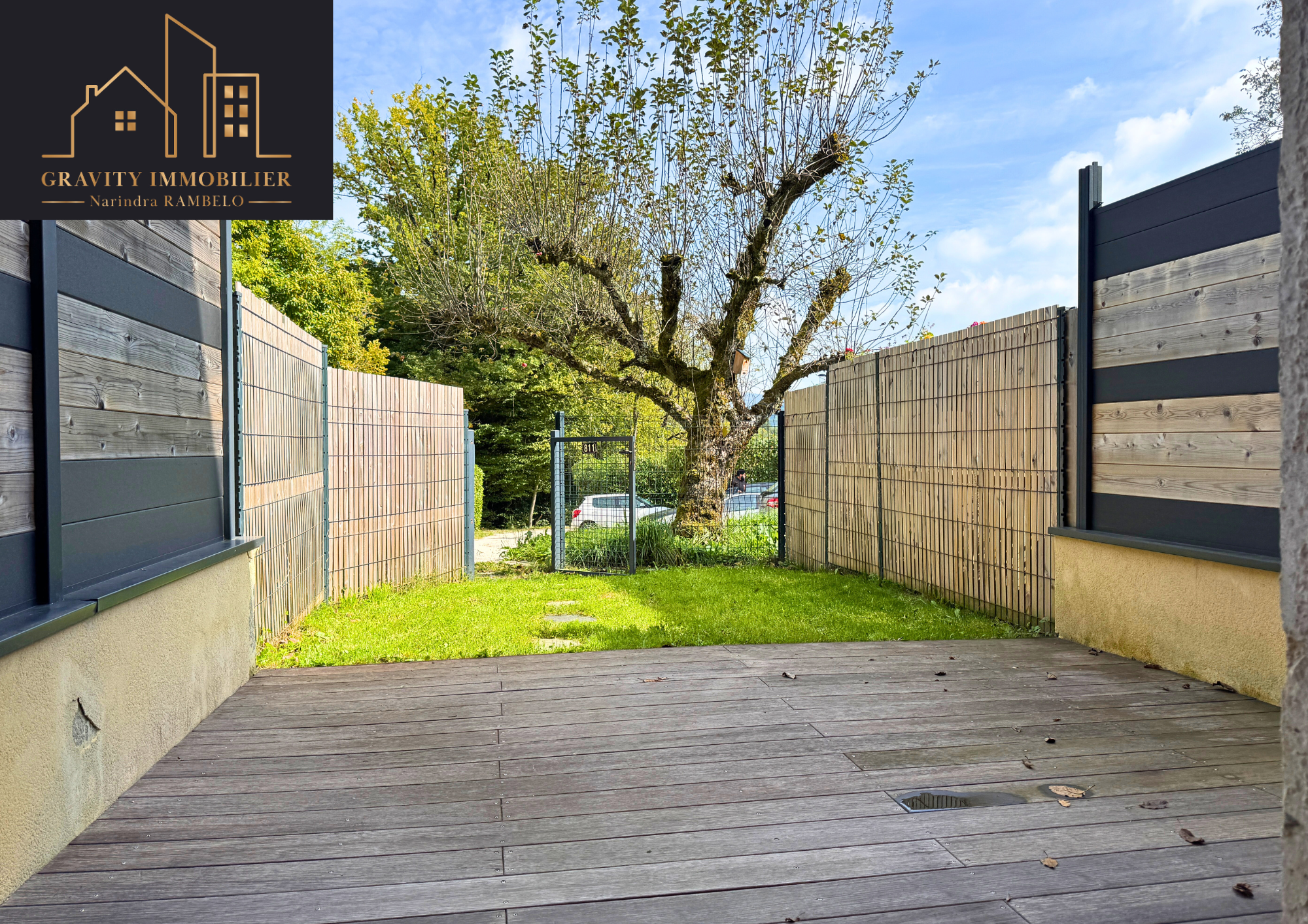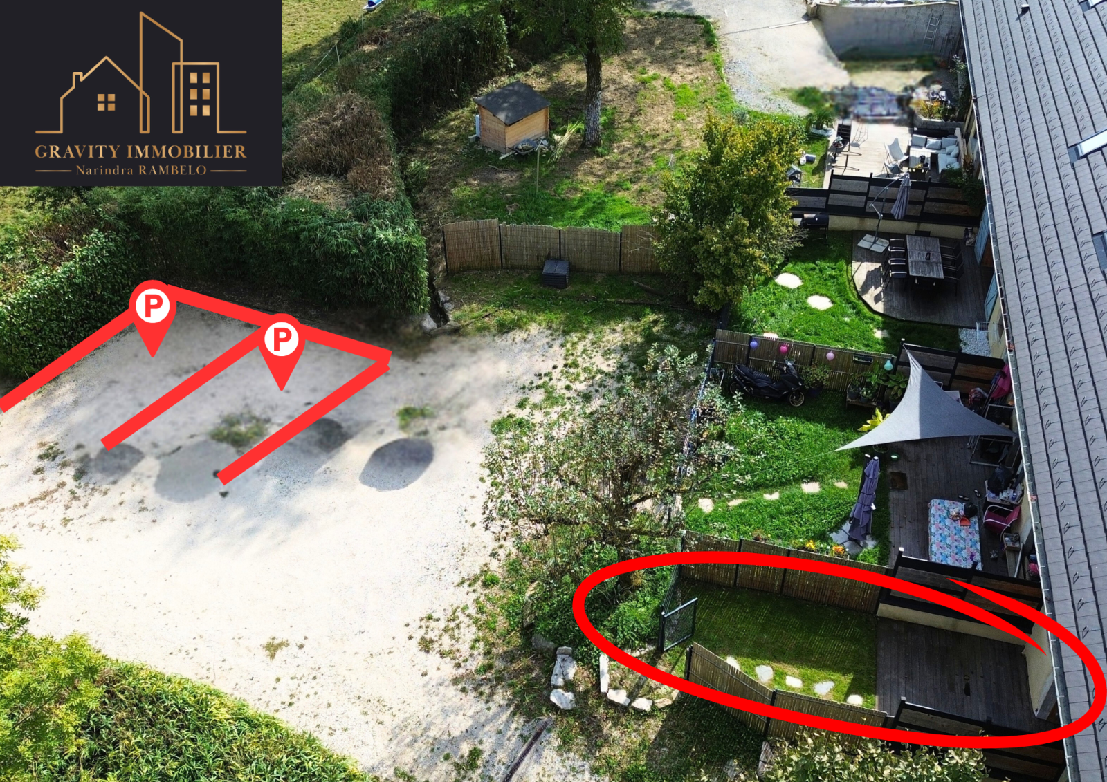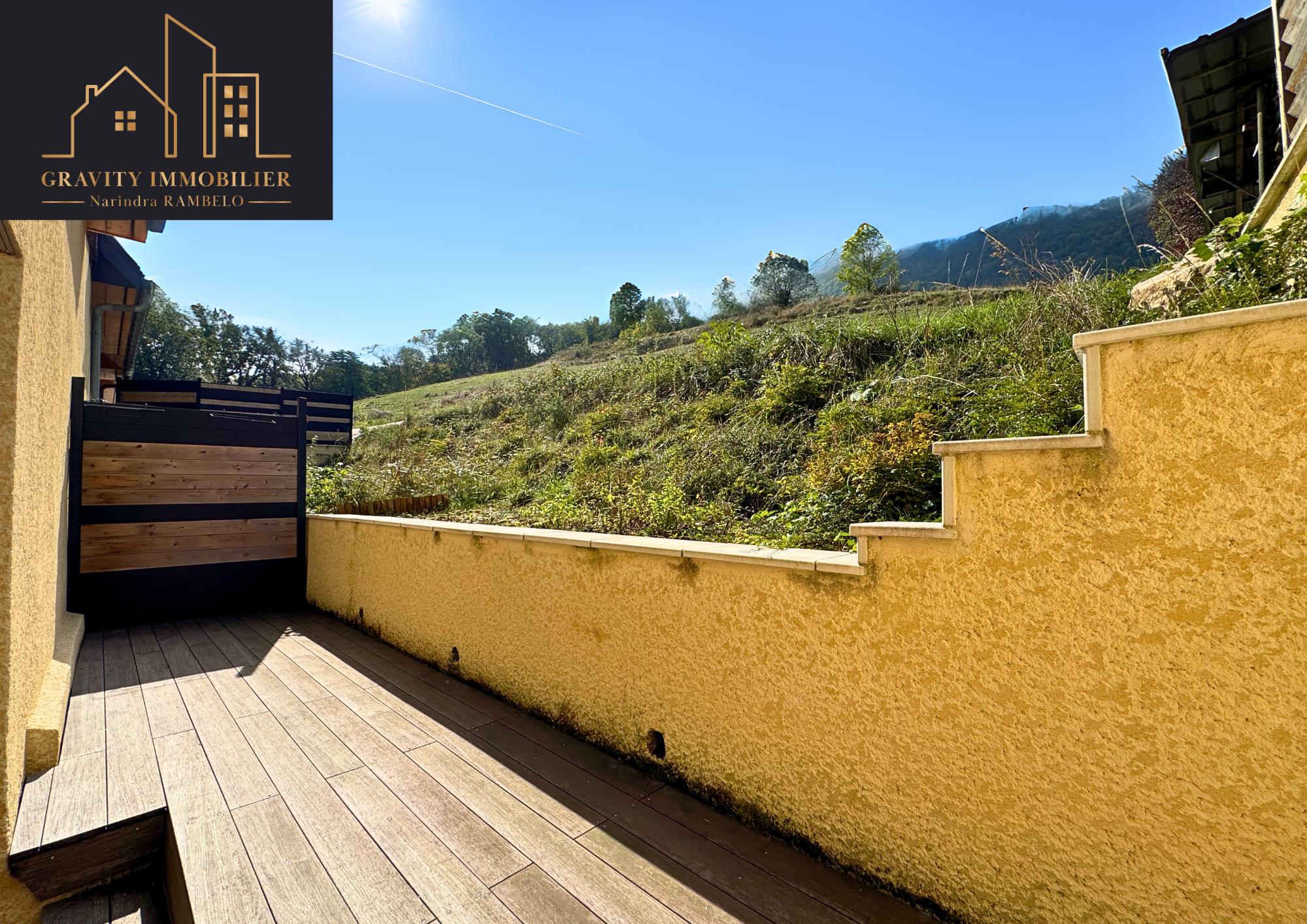 Jardin et terrasse avant sans vis-à-vis + seconde terrasse arrière avec possibilité de jardinet ;
