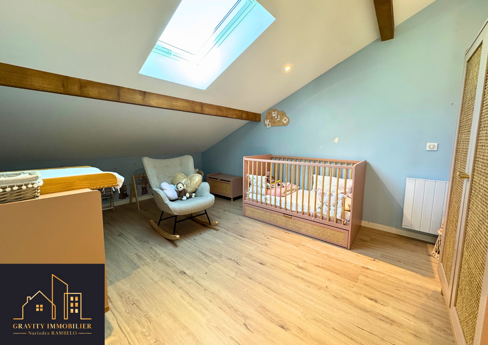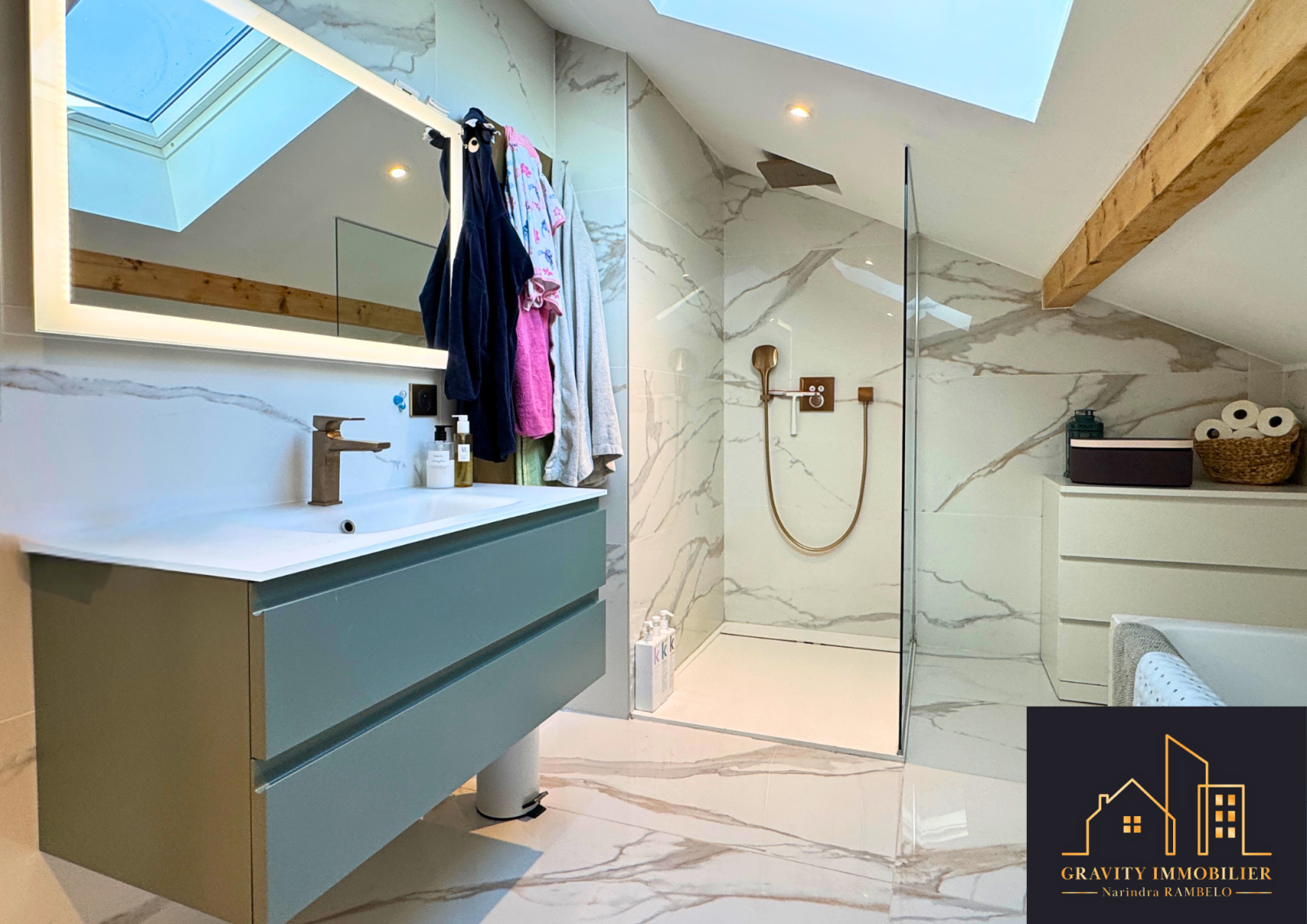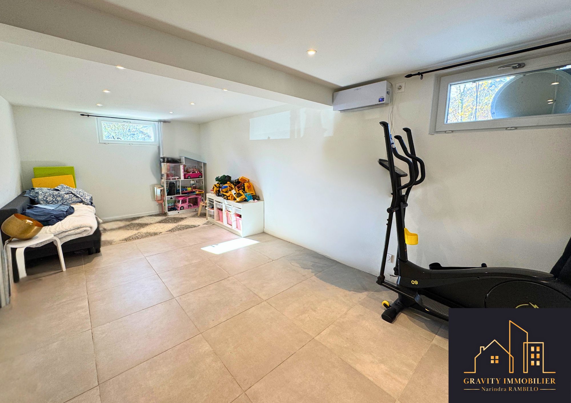 Le sous-sol aménagé comprend une suite parentale avec salle d’eau privative et WC, une buanderie, un espace de rangement, et un accès direct au garage.