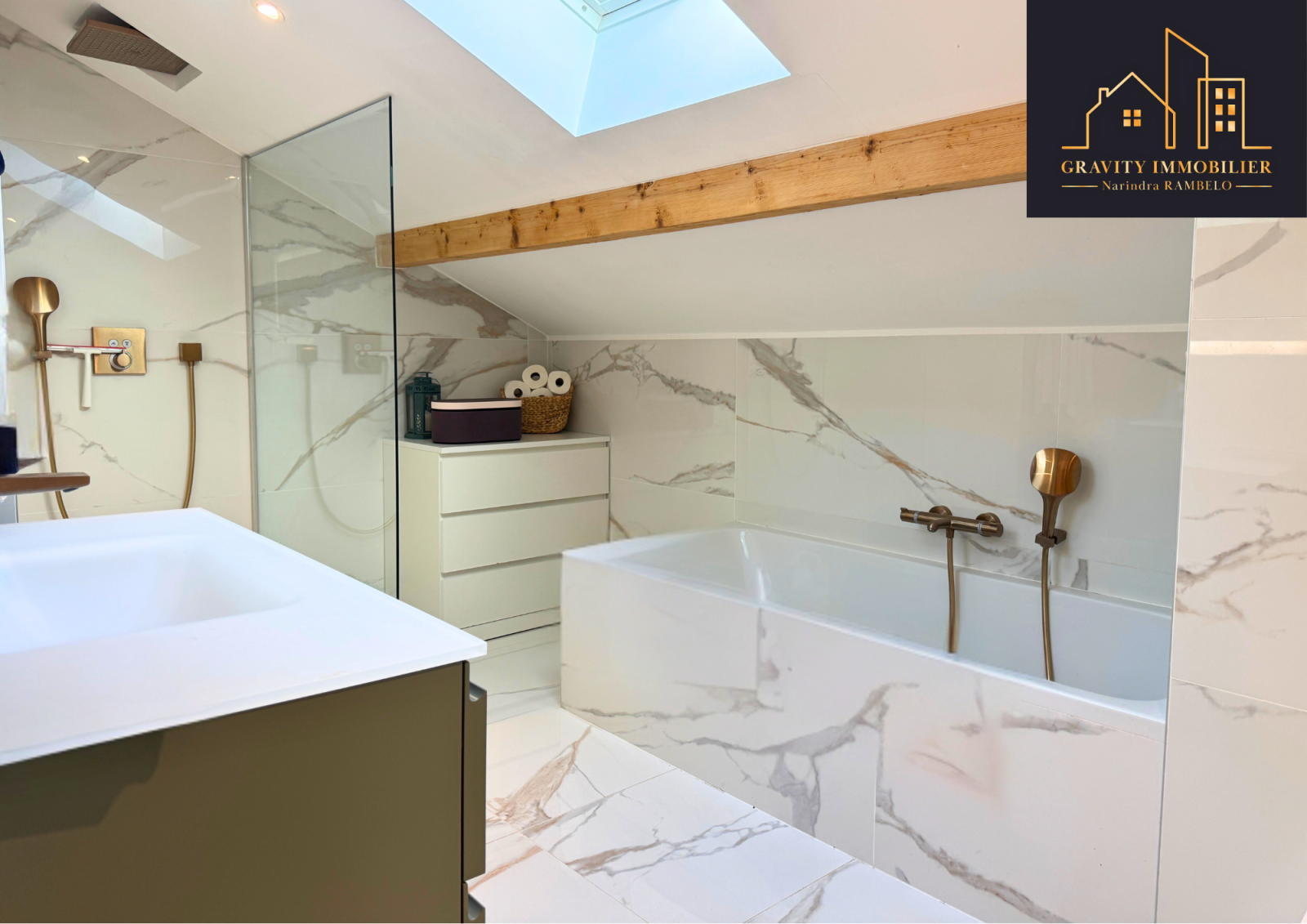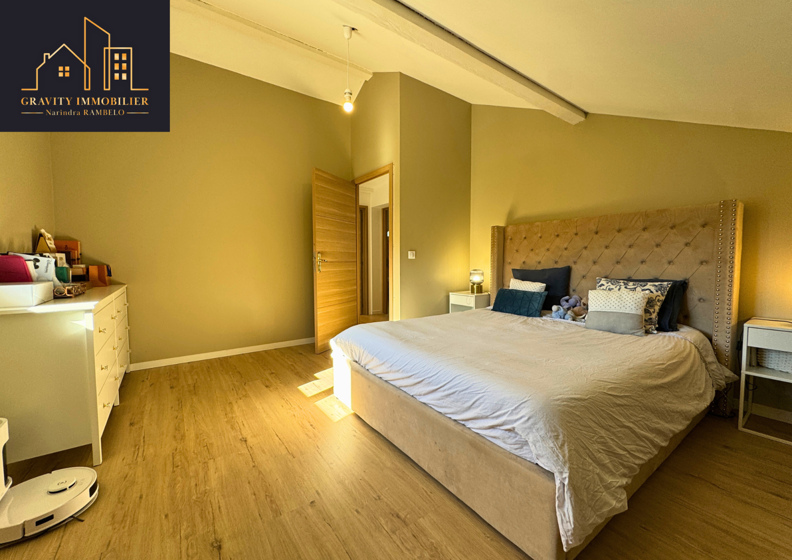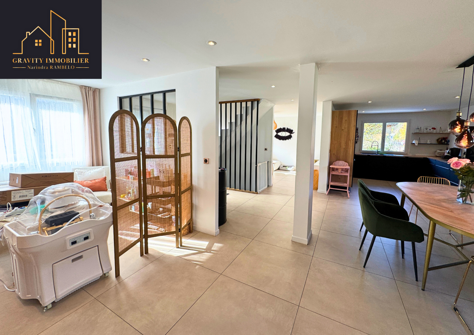Le sous-sol aménagé comprend une suite parentale avec salle d’eau privative et WC, une buanderie, un espace de rangement, et un accès direct au garage.