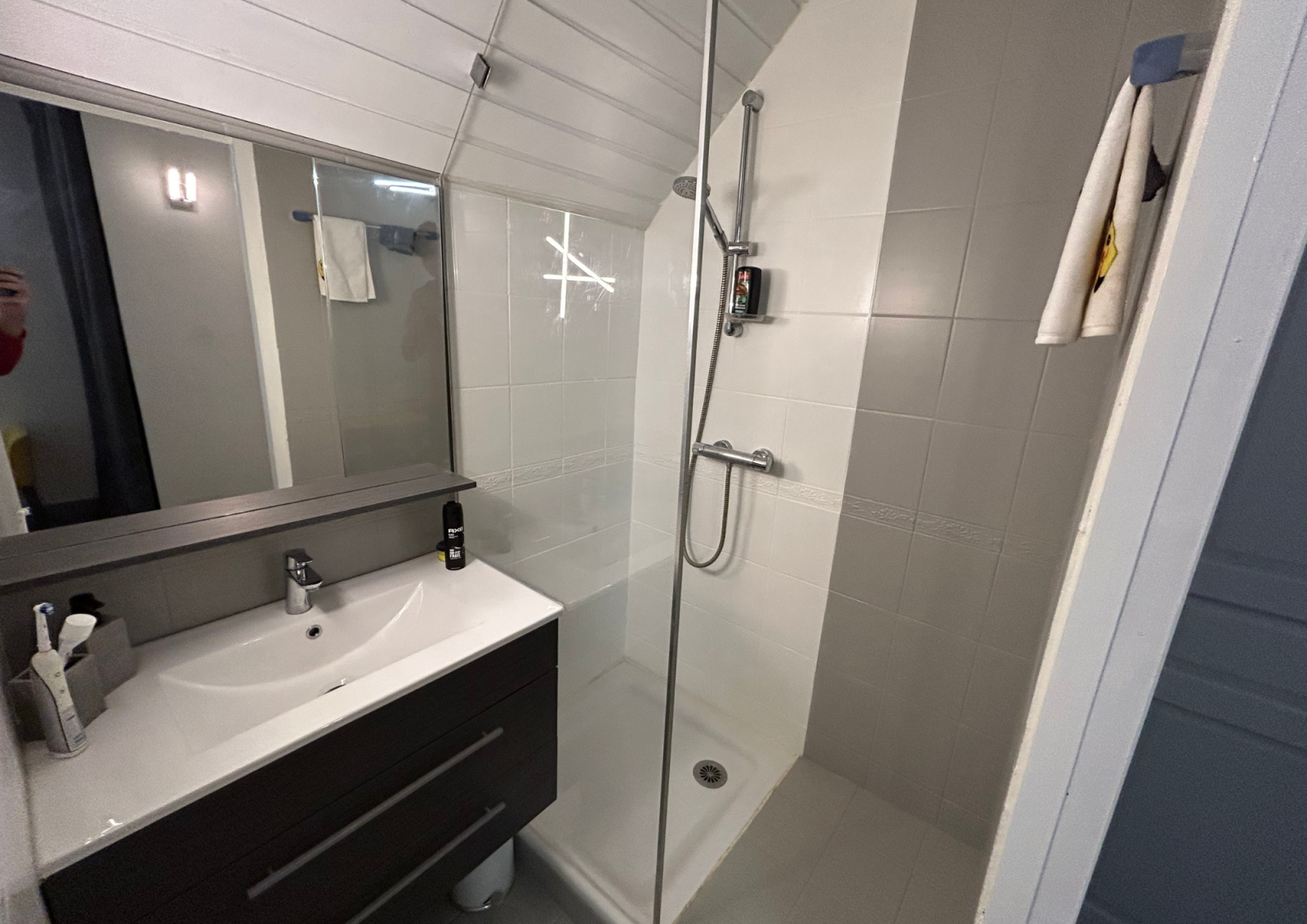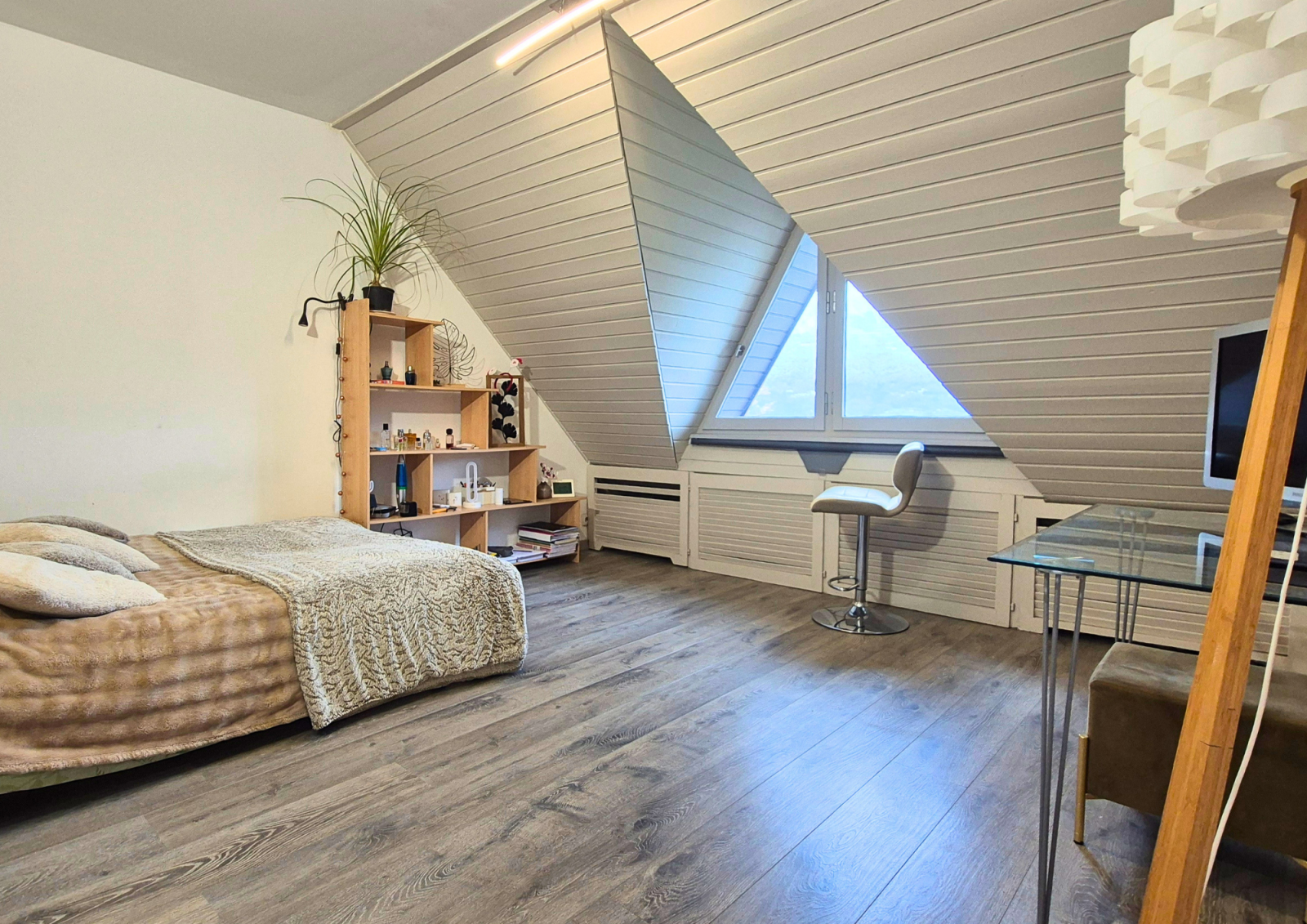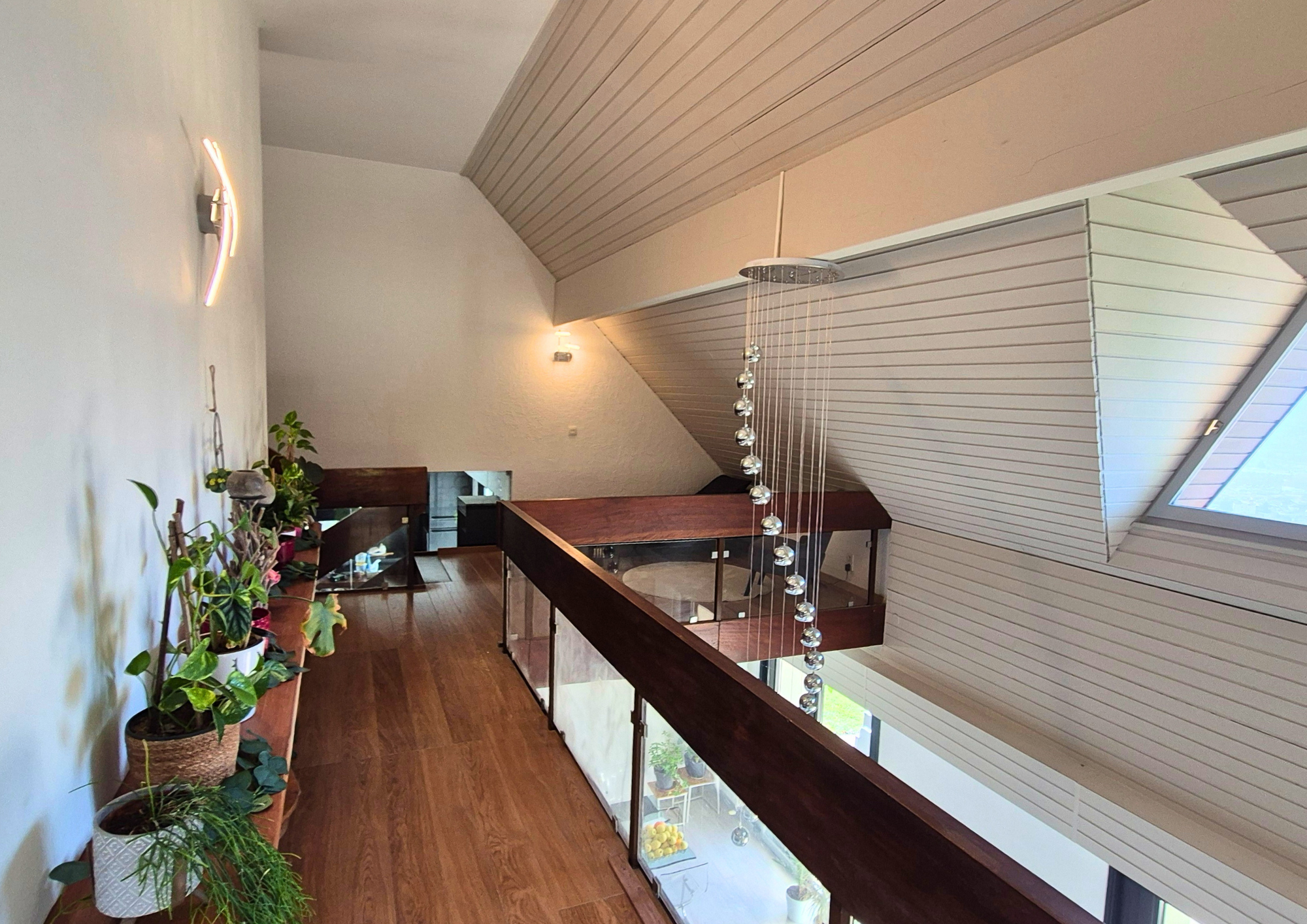 À l’étage, une mezzanine surplombe le séjour, complétée par un palier pouvant accueillir un espace bureau. Trois chambres composent cet étage, dont deux disposent de leur propre salle d’eau ou salle de bain et d’un accès balcon, ainsi qu’une salle d’eau indépendante et un WC.