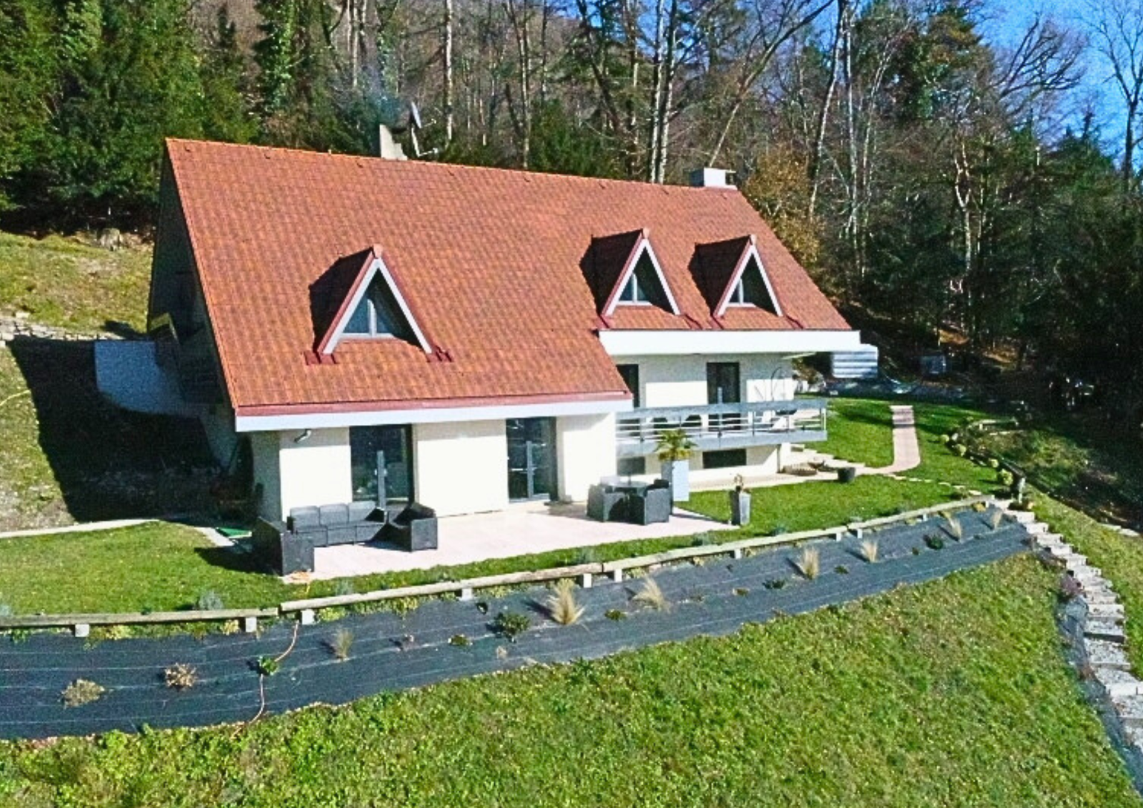 À l’extérieur, le terrain non constructible garantit une tranquillité absolue et une vue dégagée sur la nature environnante.