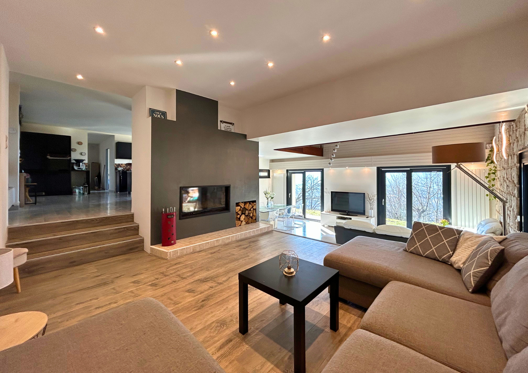 Au niveau principal, vous trouverez une entrée, une cuisine récente entièrement équipée et ouverte, un espace convivial avec cheminée, ainsi qu’un vaste séjour/salle à manger baigné de lumière grâce à son volume, une chambre ouvrant sur un balcon et un W.C indépendant.