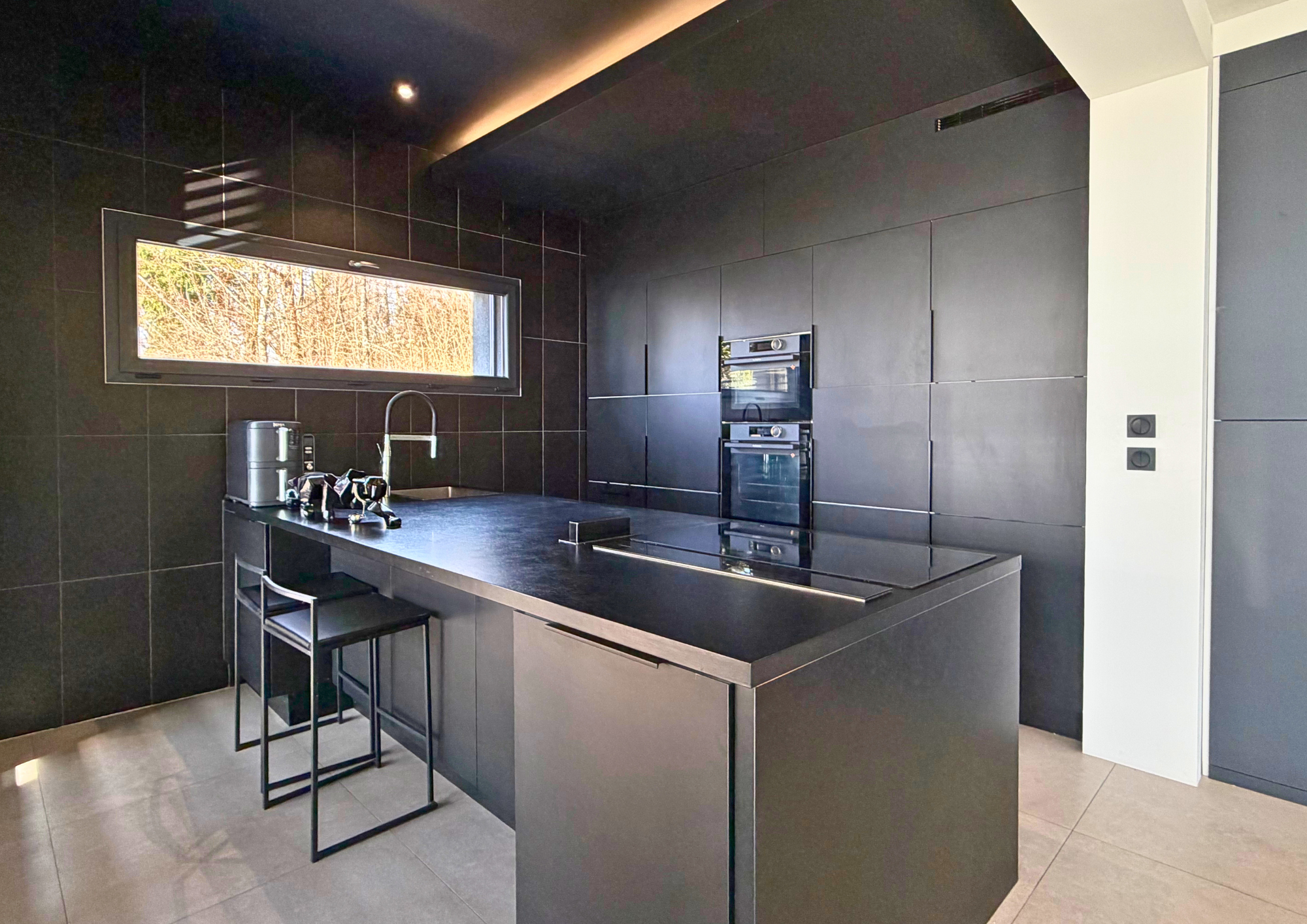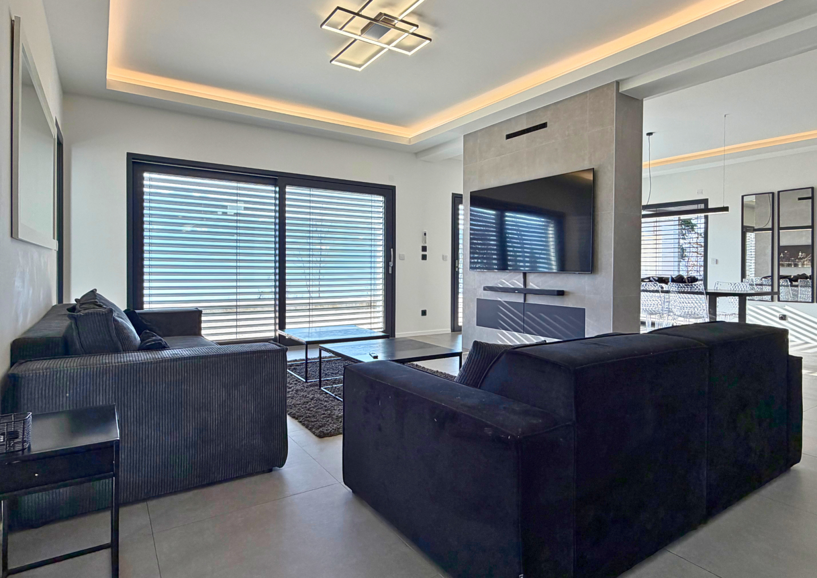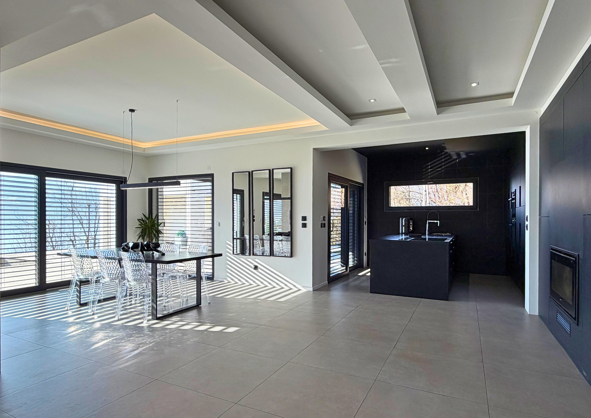 Dès l’entrée, le ton est donné : une pièce de vie spectaculaire, baignée de lumière naturelle, composée d’une cuisine ouverte entièrement équipée, d’un vaste salon et salle à manger orientés vers l’extérieur, créant une parfaite continuité entre intérieur et jardin.