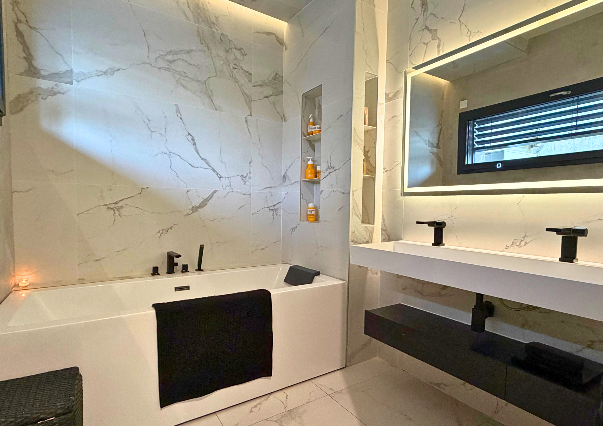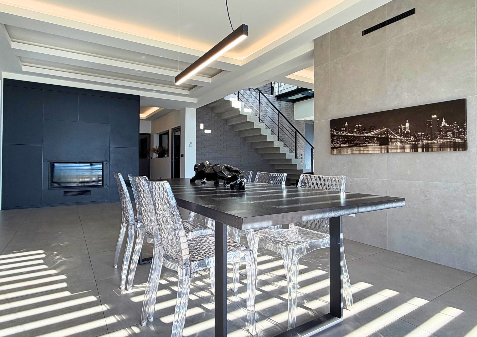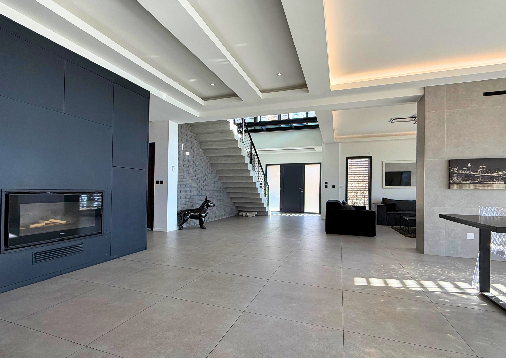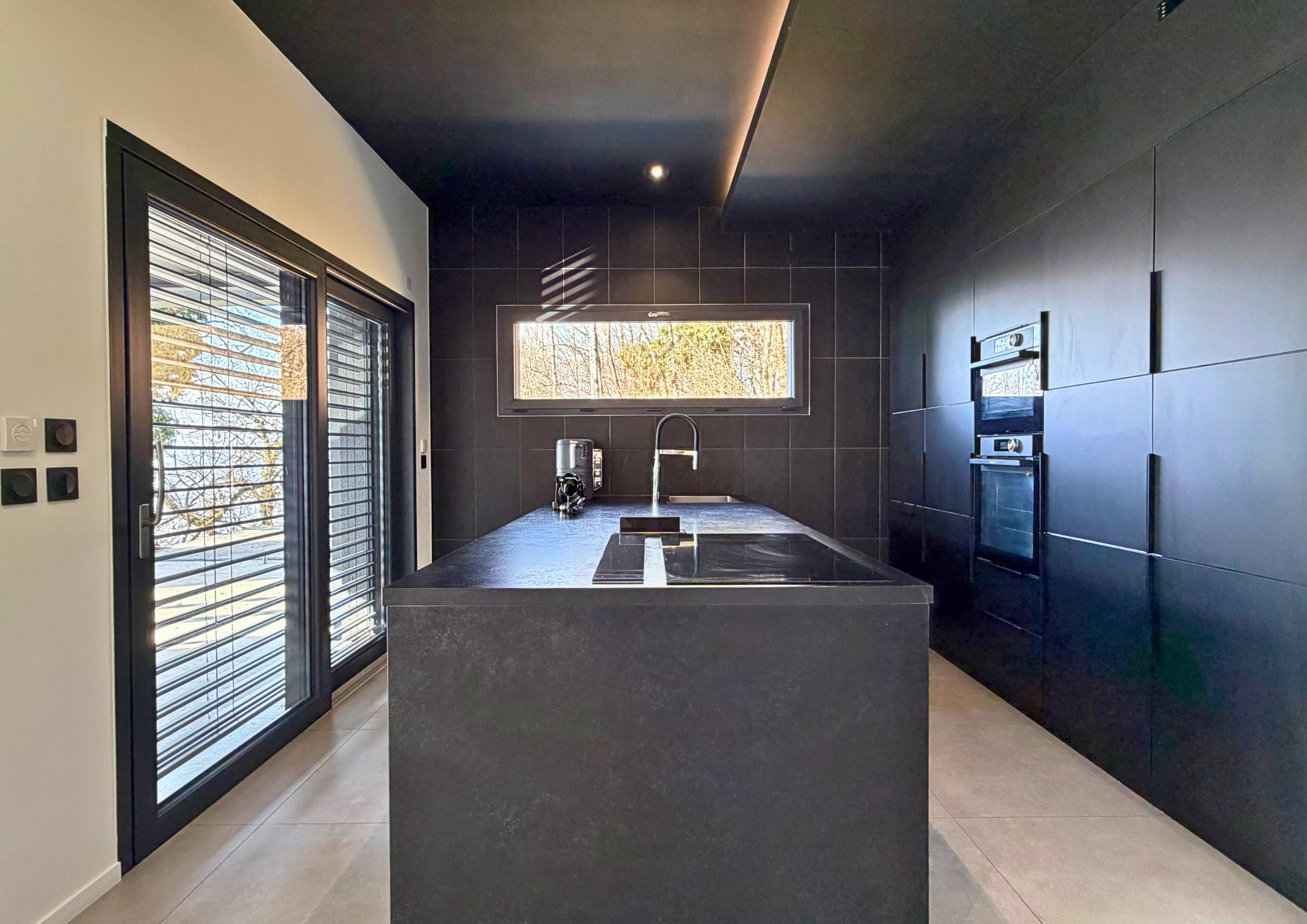 Dès l’entrée, le ton est donné : une pièce de vie spectaculaire, baignée de lumière naturelle, composée d’une cuisine ouverte entièrement équipée, d’un vaste salon et salle à manger orientés vers l’extérieur, créant une parfaite continuité entre intérieur et jardin.