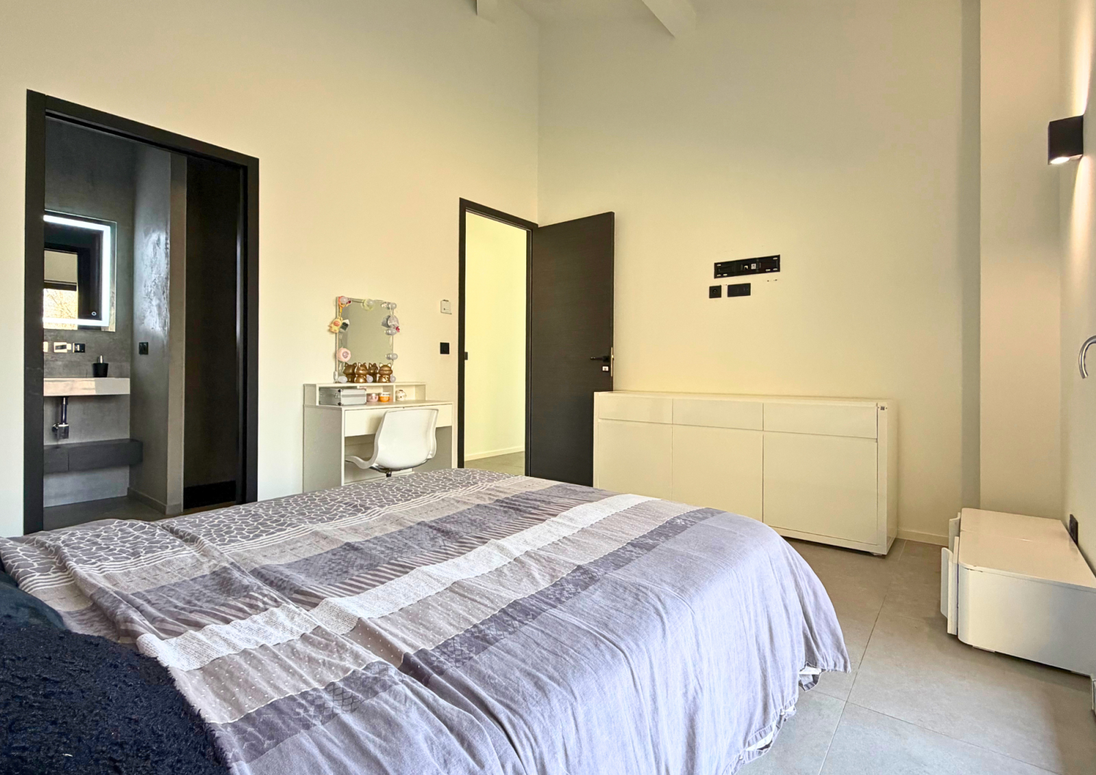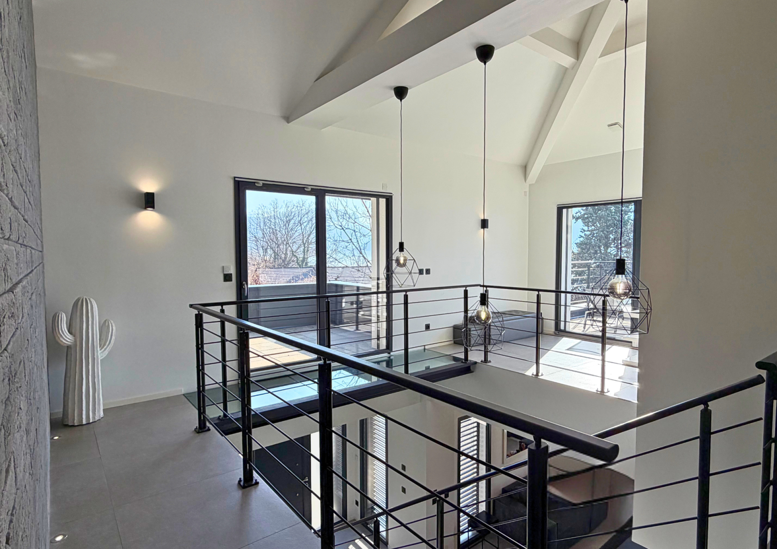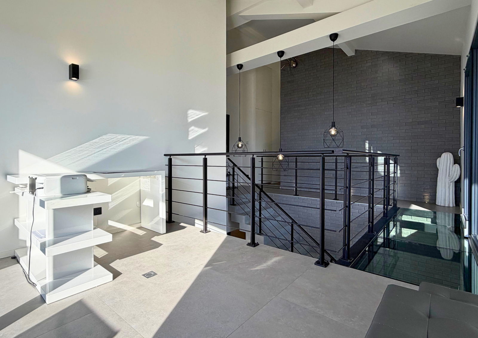 À l’étage, une passerelle en verre suspendue mène à un bureau lumineux avec vue dégagée, puis à trois suites indépendantes, chacune disposant de sa salle de bains, toilettes et terrasse privative, garantissant intimité et bien-être à chaque occupant.