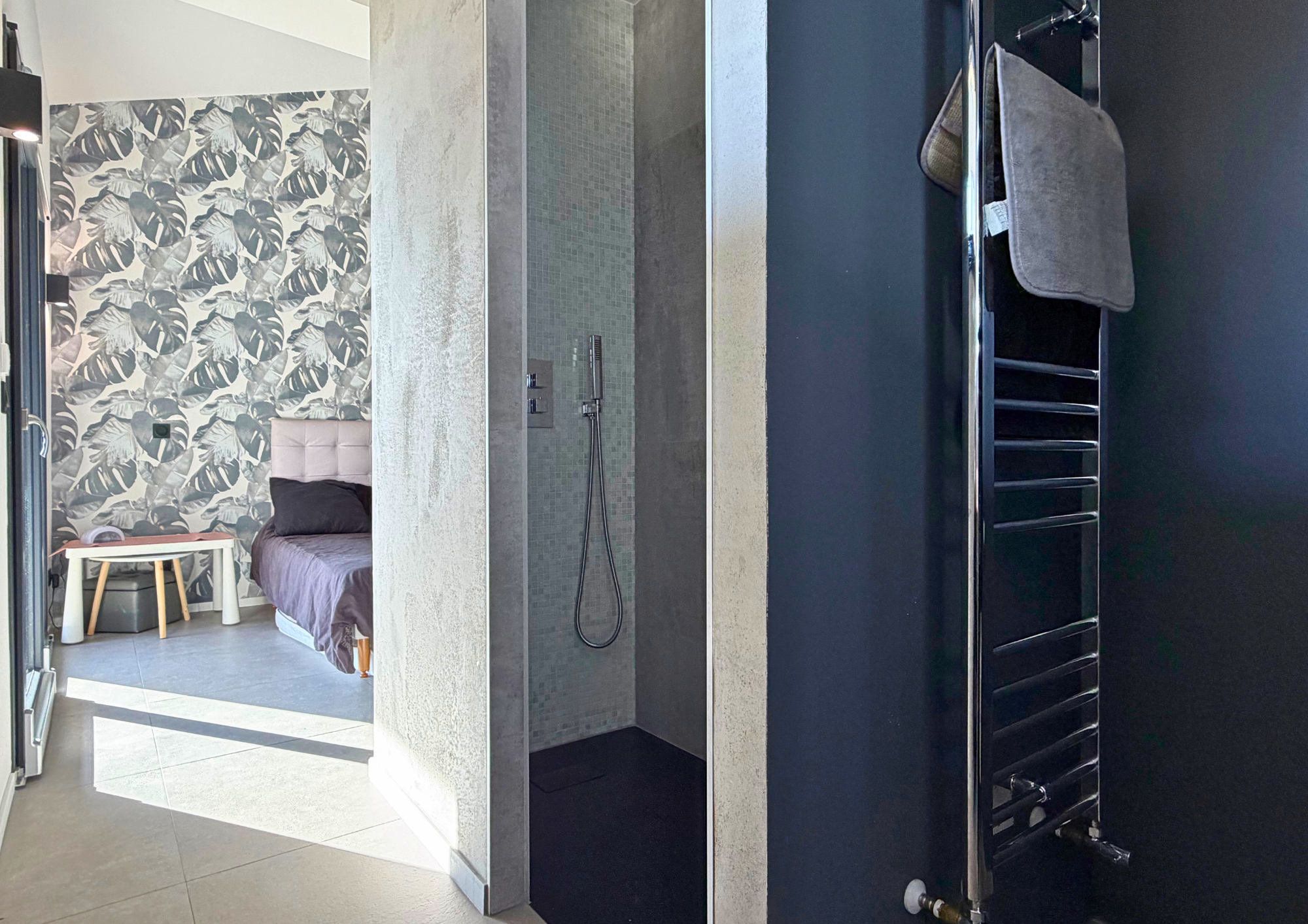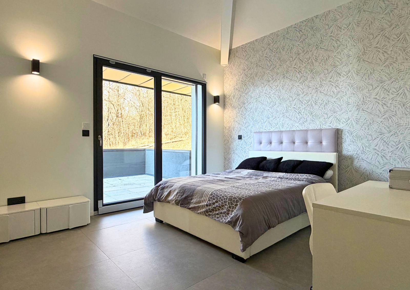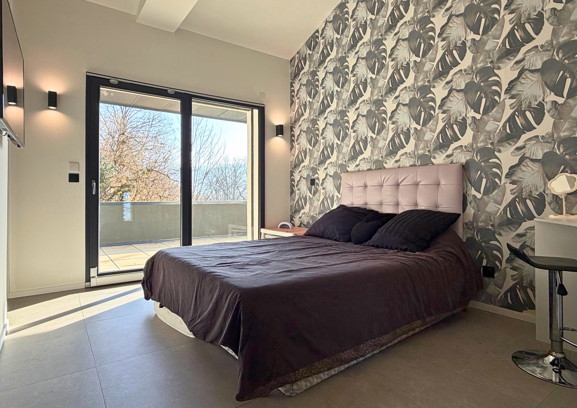 À l’étage, une passerelle en verre suspendue mène à un bureau lumineux avec vue dégagée, puis à trois suites indépendantes, chacune disposant de sa salle de bains, toilettes et terrasse privative, garantissant intimité et bien-être à chaque occupant.