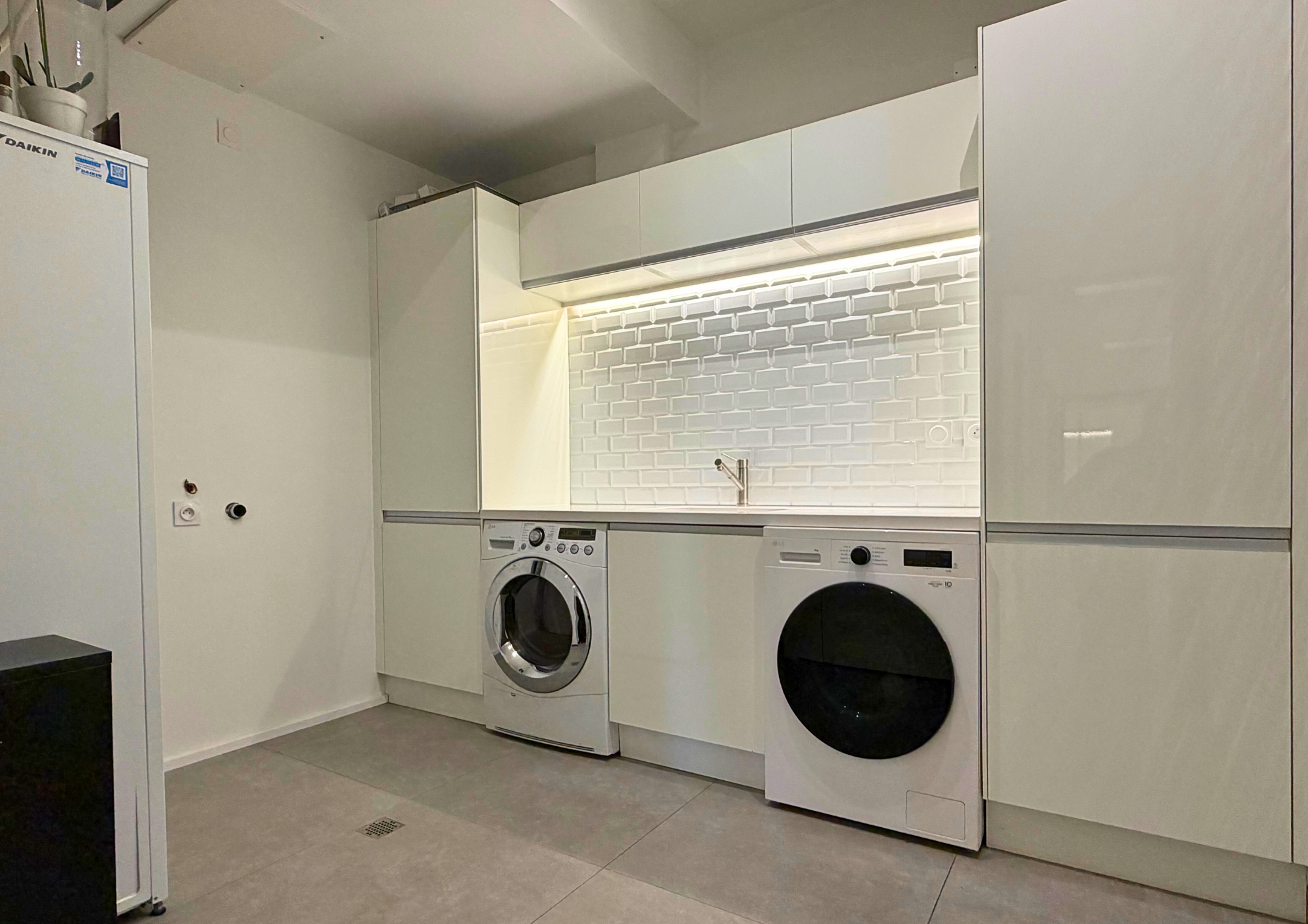 Un double garage carrelé, chauffé et sécurisé, visible depuis l’intérieur de la maison et accessible directement depuis celle-ci, vient parfaire les prestations.